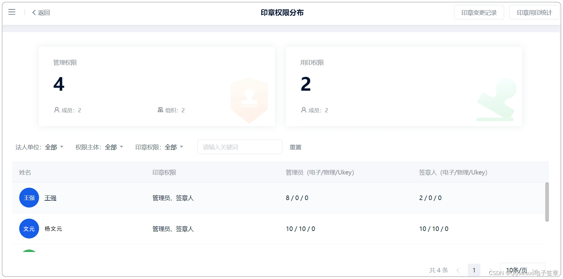 现在,打开数据看板就能查看公司所有印章的管理和使用分配情况;比如“某一枚印章谁在管、谁能用”;“某员工具体负责管理哪些印章,都有哪些印章的使用权限”,无需等人汇报、随时掌控详情。