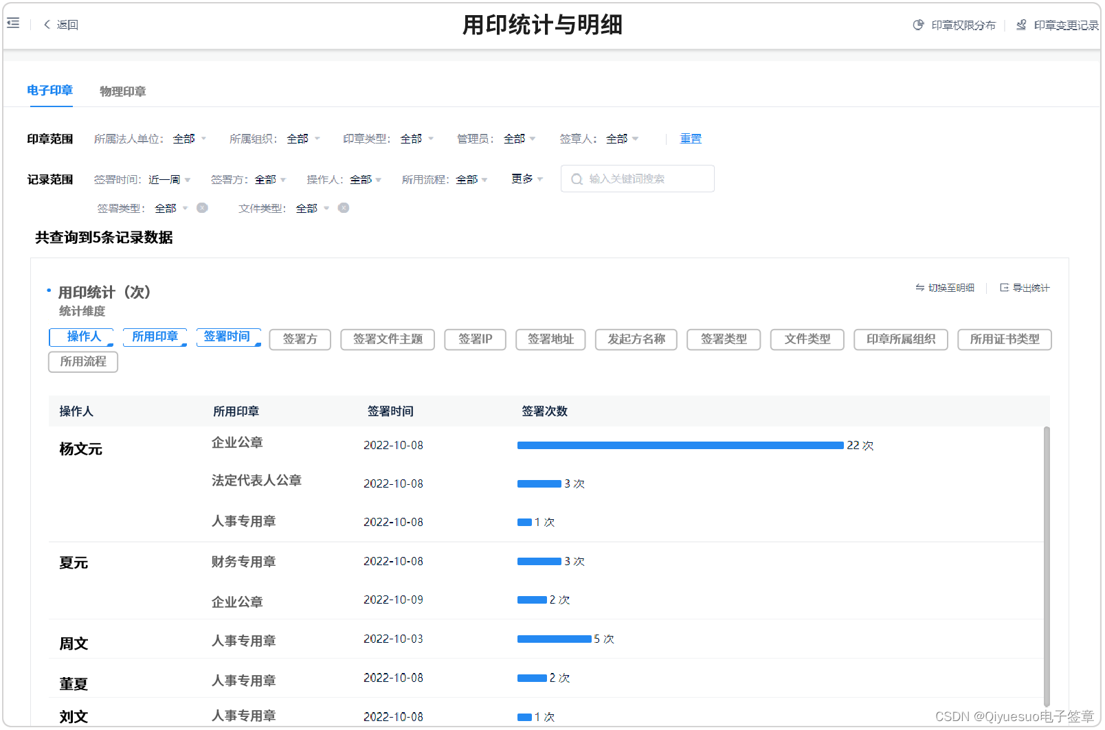 现在,通过印章数据看板您可以随时随地调取任何时间段、各类印章的使用记录,比如:合同章近一周的使用情况,谁发起、谁审批、谁签署、签了哪些文件、在哪签的都能一一调取,更详细、更精准。