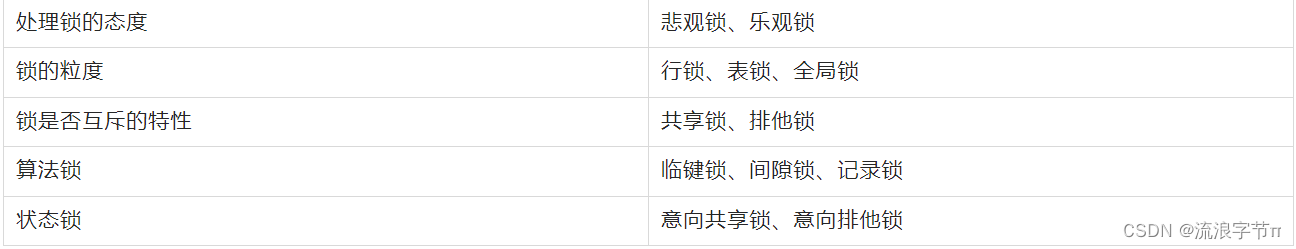 按照粒度分为锁定整个表的表级锁(table-level locking)和锁定数据行的行级锁(row-level locking):
