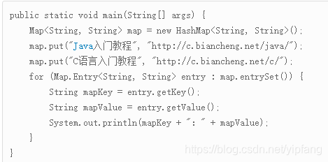 | Set entrySet() | 返回 Map 集合中所有键-值对的 Set 集合,此 Set 集合中元素的数据类型为 Map.Entry |