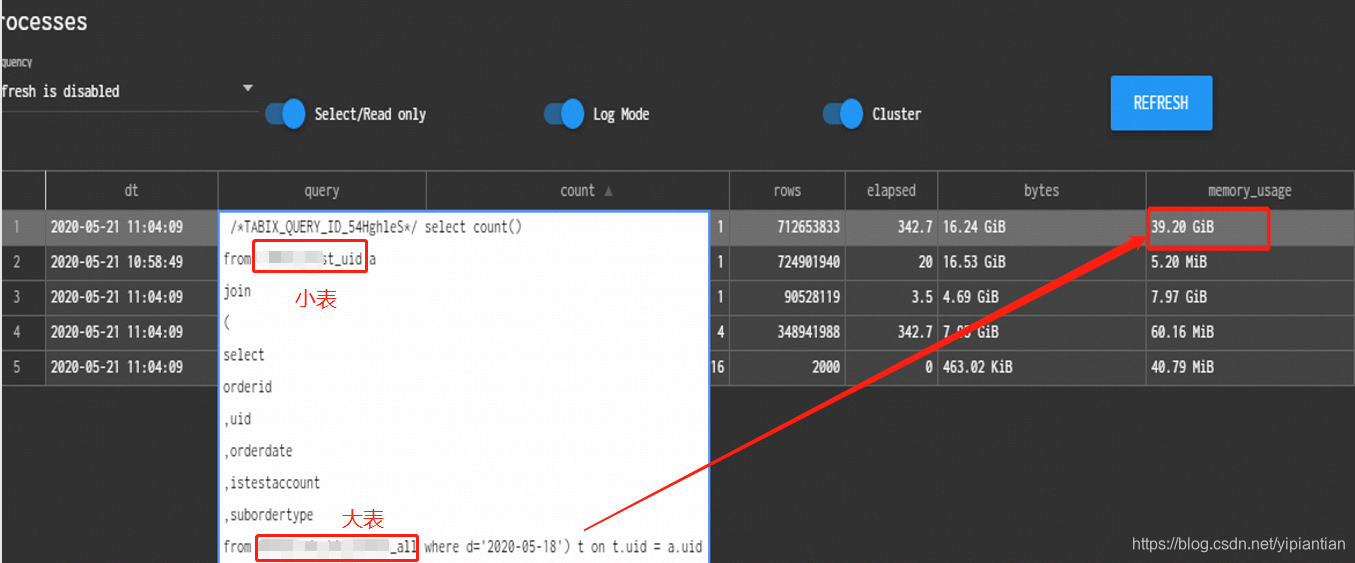 关于大小表关联问题,一般情况小表放在join右边消耗内存会比较小(一般比较多并行任务建议使用这种方式),放在join左边消耗内存会比较大,下图是大小表管理案例:
