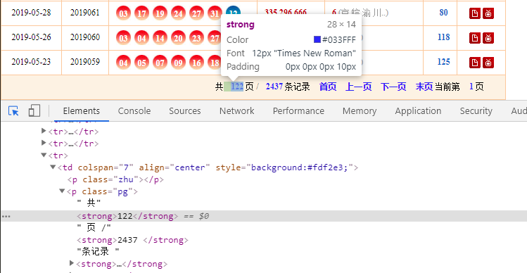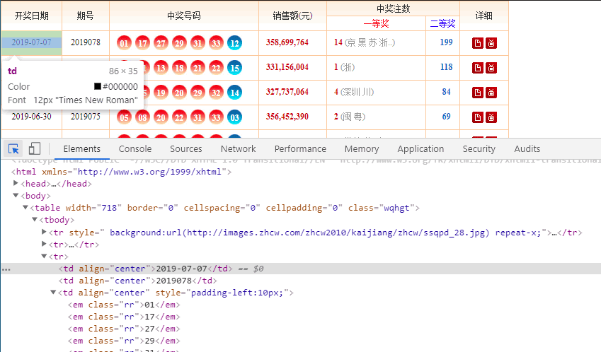 接下来,我们需要抓取每一页中的具体开奖信息。我们继续通过开发者工具分析出每期开奖信息。