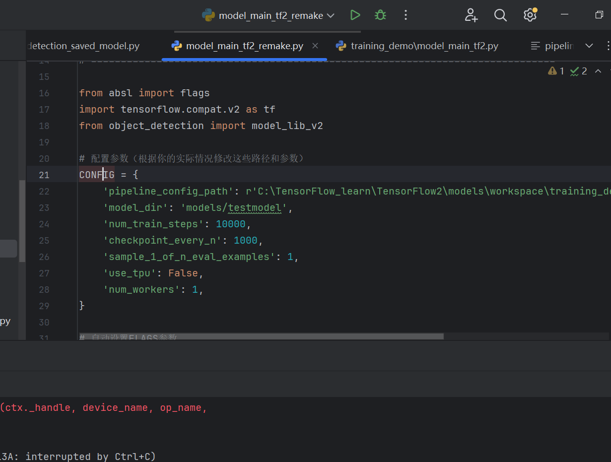 使用models/workspace/training_demo/model_main_tf2_remake.py(这个是我自己修改的文件,也可以使用官方的文件TensorFlow/models/research/object_detection/model_main_tf2.py,但是要在命令行中使用)文件,修改目录,