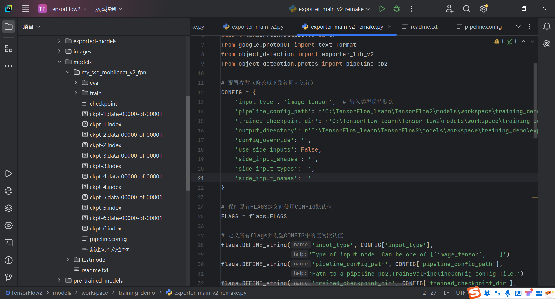 使用 models/workspace/training_demo/model_main_tf2_remake.py(这是我自己修改的,这样就不用在命令行中使用,TensorFlow/models/research/object_detection/exporter_main_v2.py官方文件)