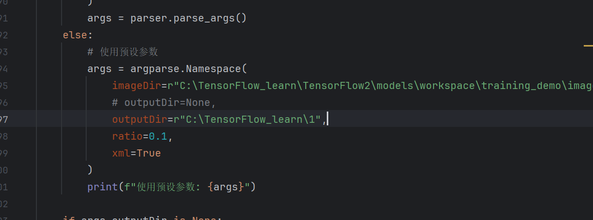 修改目录,imageDir是图片输入的目录,outputdir是输出的目录,ratio是测试集和训练集的比例,图中表示测试集占0.1,训练集占0.9。
