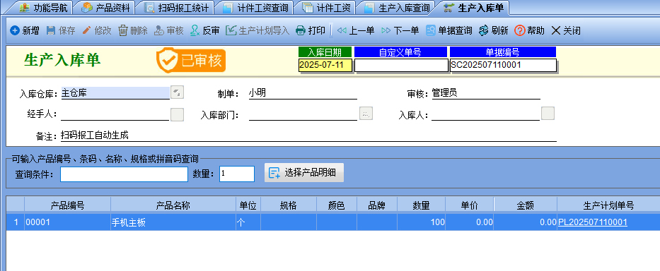 八、【生产管理】-【生产入库查询】如果设置了报工完成后自动生成成品入库单,则最后一个工序完工后,自动生成一张生产入库单,打开审核后则增加成品的库存。
