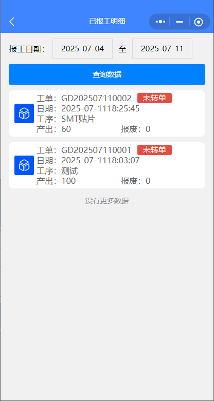 看到只属于自己未完工的工序,可以直接点击某个工序进行输入产出数量进行报工,如果是严格工序流程,则必须按顺序进行报工。
