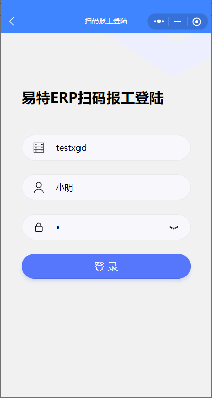 六、员工手机报工,打开小程序或是手机APP,点击底部的【扫码报工】进到报工登陆界面,输入刚才的员工姓名和密码登陆,默认进来后