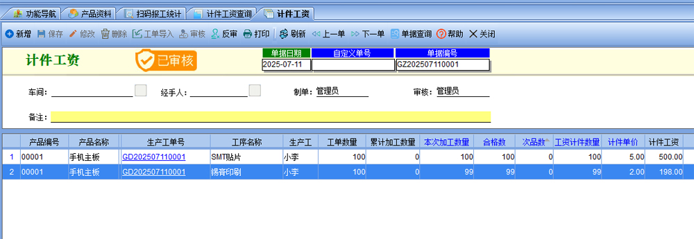 九、【生产管理】-【计件工资查询】可以看到扫码报工转入进来的计件工资,可以对报工的内容再进行修改,数量,计件单价都可以修改,最终审核以后