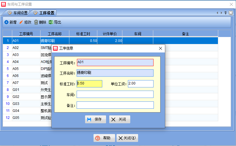 一、【基本信息】-【车间与工序设置】,打开如下图,在工序设置中设置好所有的工序。