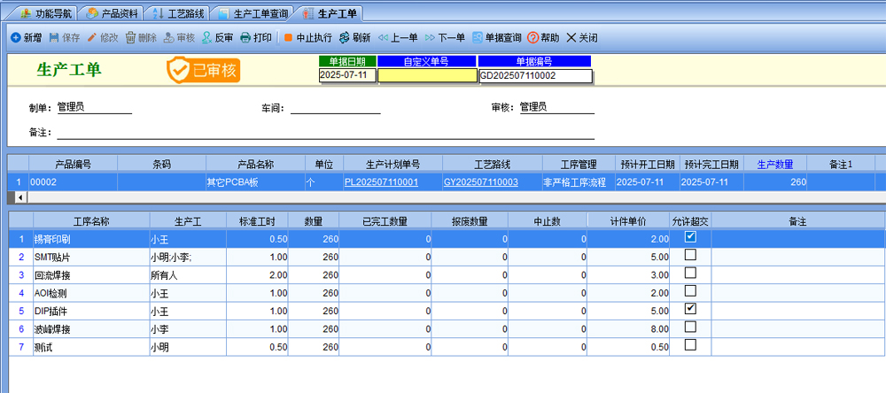 四、【生产管理】-【生产工单】,可以手动创建一个工单,选择产品后,自动根据当前产品的工艺路线带出工序,也可以手动修改工序及生产工和各项参数。