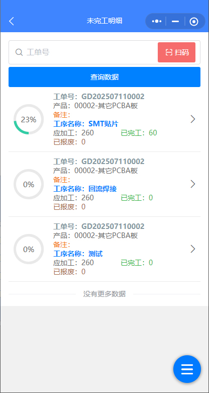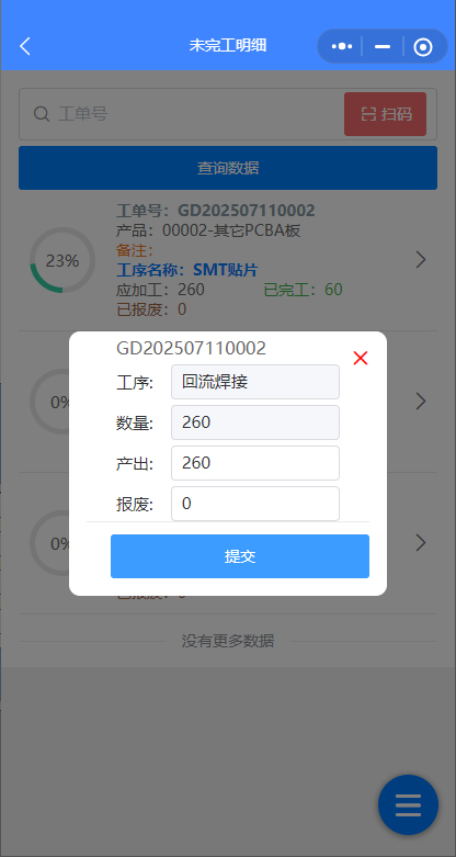 点击某个工序后,直接填上产出数量与报废数量,如果为严格工序流程控制,工单数量100,如上个工序总的产出数为99,报废数为1,