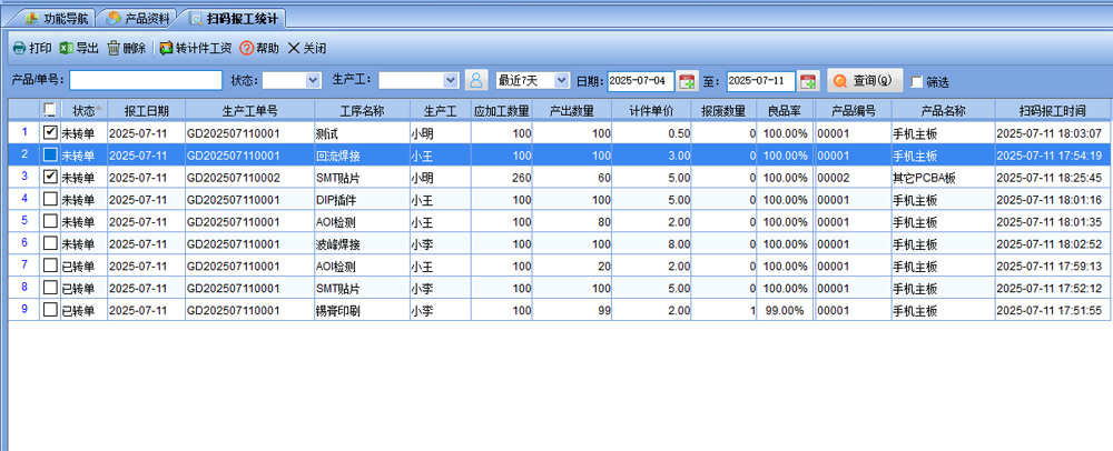 七、【生产管理】-【扫码报工统计】可以看到扫码报工的明细,可以选择某个员工的查询,最后打勾,点击【转计件工资】则生成计件工资单,