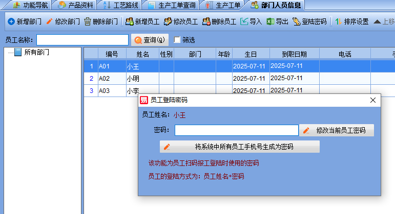 这样所有能登陆授权的员工都可以报工,员工登陆后只能看到属于自己的工序或是生产工为所有人的工序。