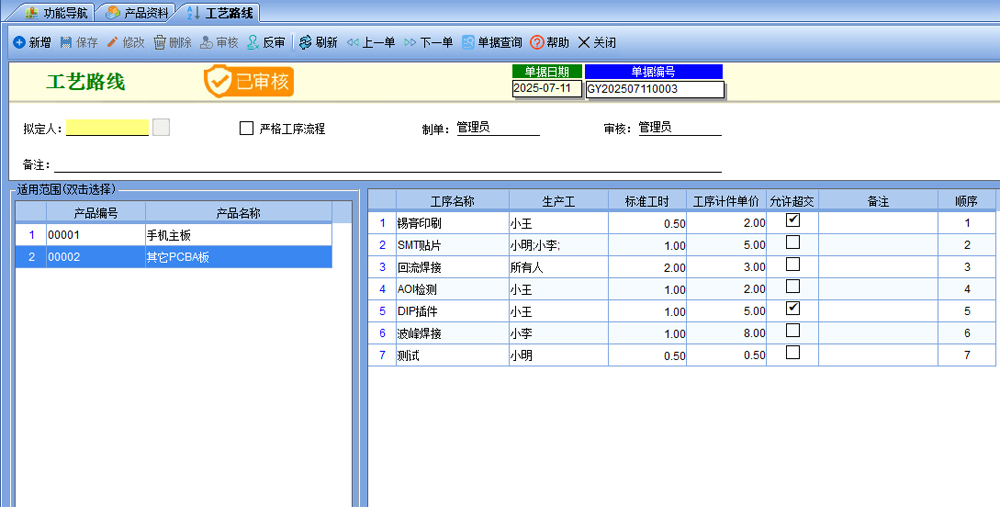 三、【生产管理】-【工艺路线】,设置好工艺路线,如果有多个产品的工序相同,则左边可以选择多个产品,右边选择好工序,可以指定好生产工和工序单价,