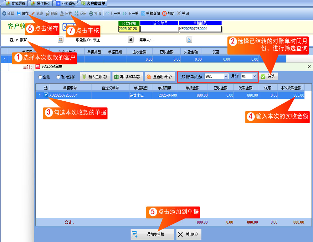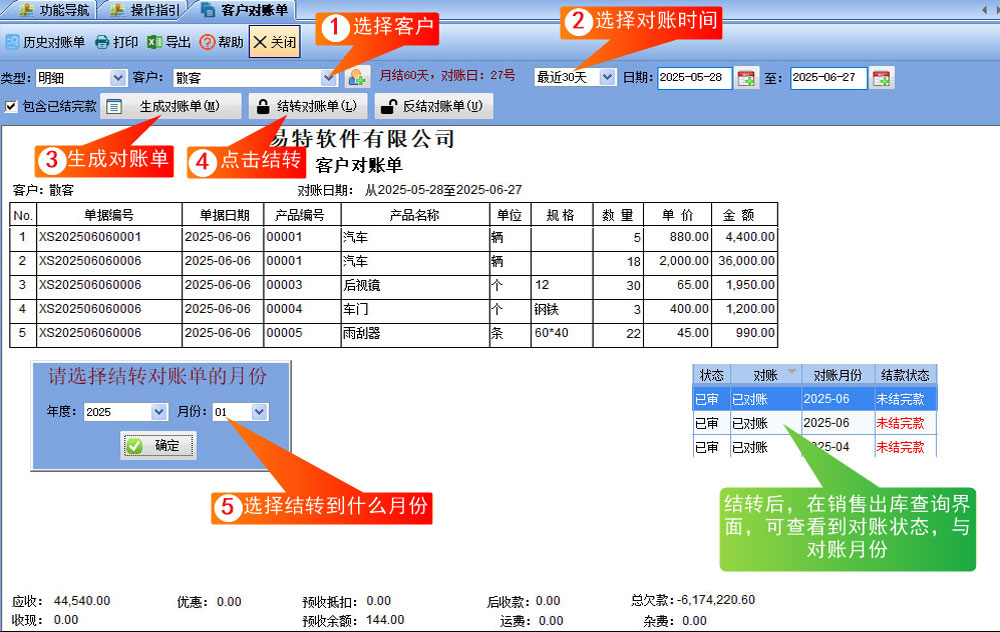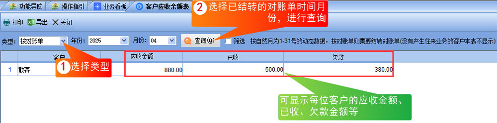 通过结转客户对账单,可以实现按对账单进行收款,以及管理查询欠款。
