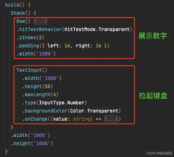 外层Stack布局,里面TextInput组件用来调起键盘,Row布局中循环出四个Text组件,Row布局覆盖在TextInput组件上,用来展示输入的数字。