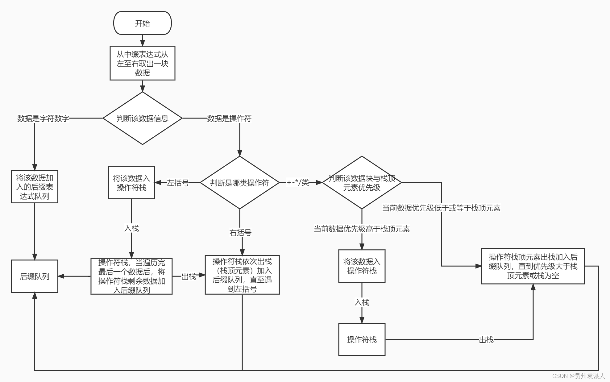 此时中缀就已经转换为后缀表达式,如下流程图所示: