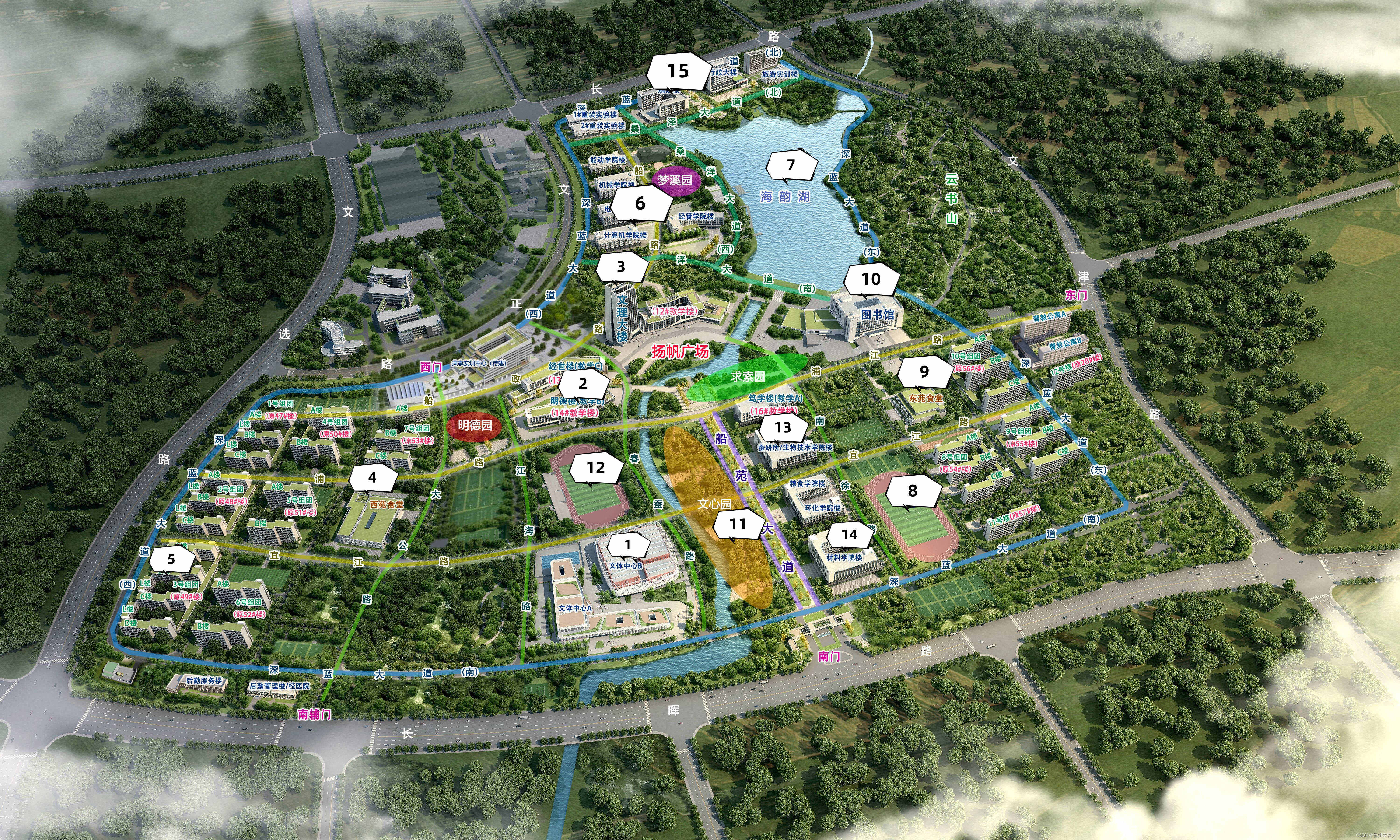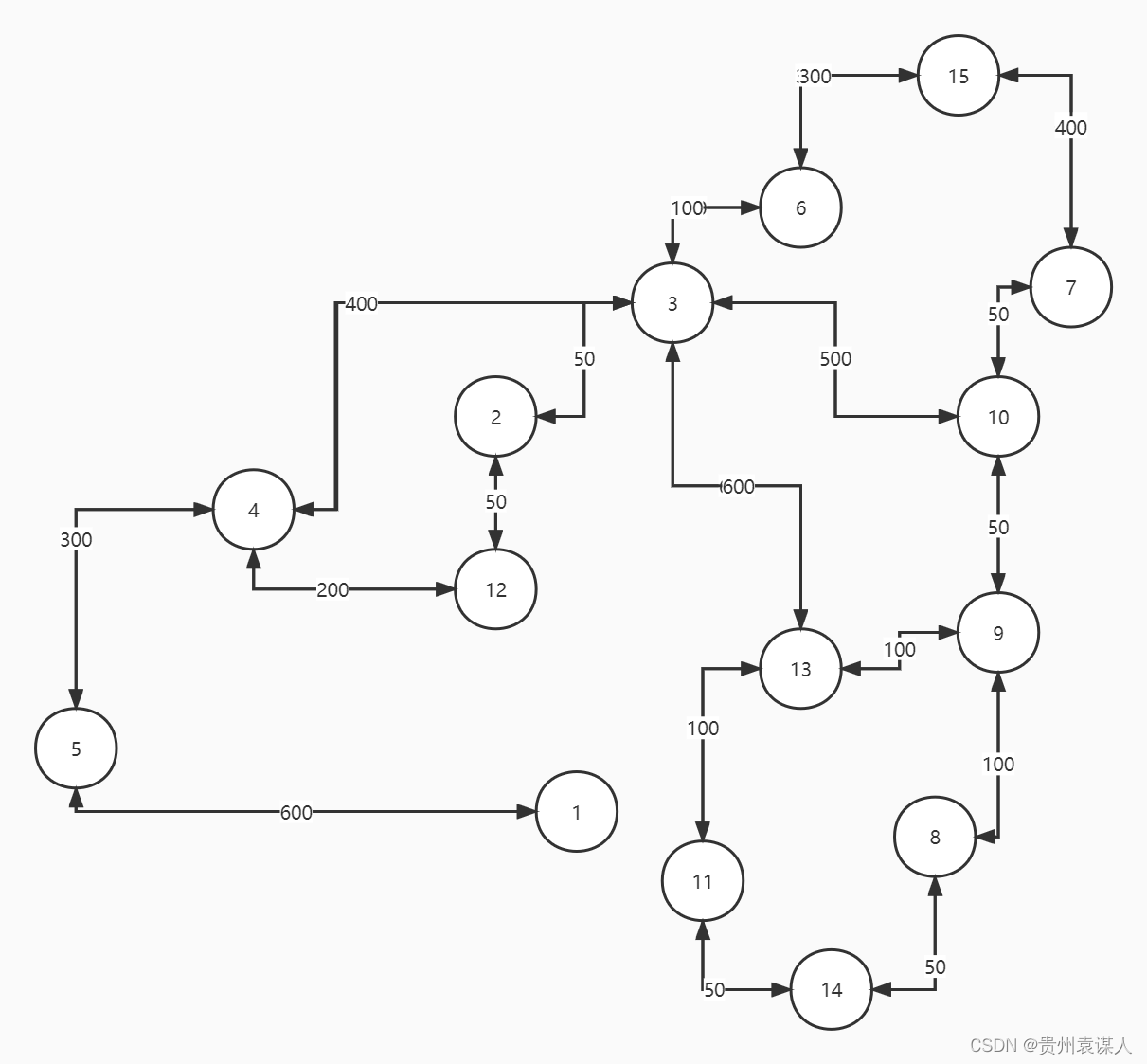 1.数据逻辑结构:该景点图为无向连通图,权值为路径长度,当任意两个景点没有邻边连接时,权值设为无穷大(用一很大的数表示即可,这里设置为10000),下图为新校区景点平面图:
