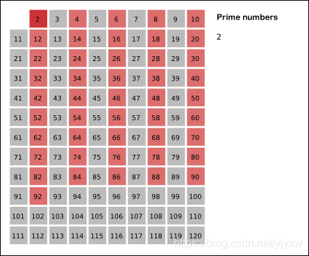 判断前2到n个数的所有素数,其中最小的数字2是素数。将表中所有2的倍数都划去。表中剩余的最小数字是3,它不能被更小的数整除,所以是素数。再将表中所有3的倍数全都划去。依次类推,如果表中剩余的最小数字是m时,m就是素数。然后将表中所有m的倍数全部划去。像这样反复操作,就能依次枚举n以内的素数