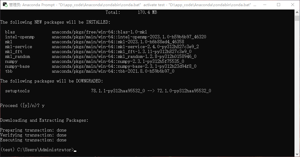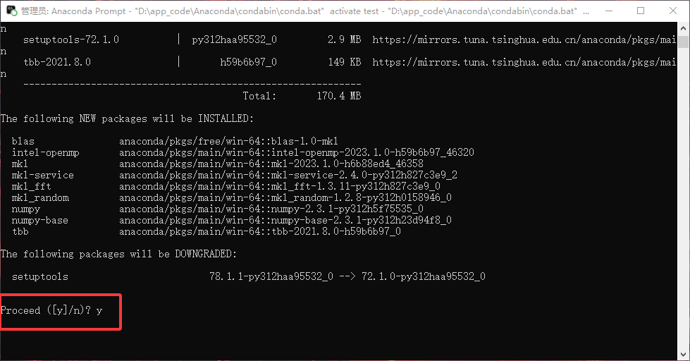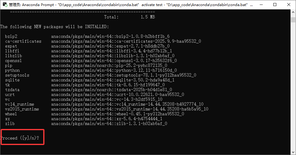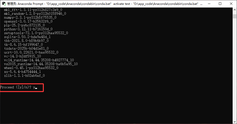 输入命令后,会出现一系列需要安装的包的信息,输入 “y” 并按下回车键,开始安装。等待安装完成,虚拟环境就创建好了。