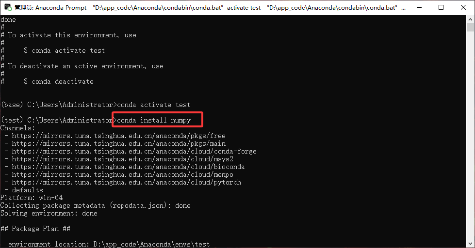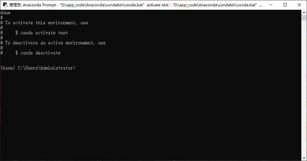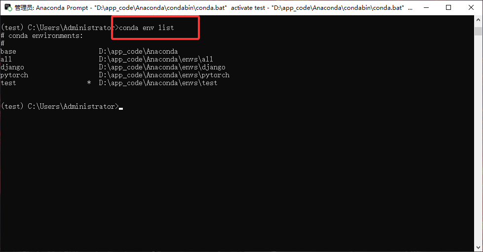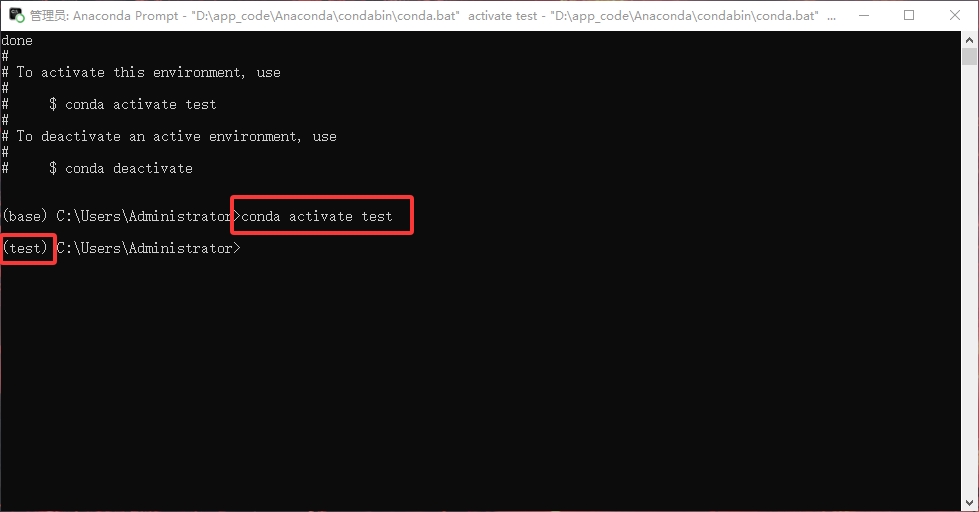 例如,在Windows系统激活名为 “test” 的虚拟环境,命令如下: