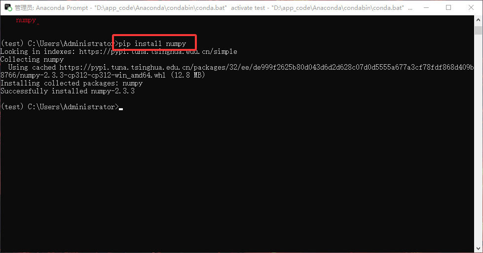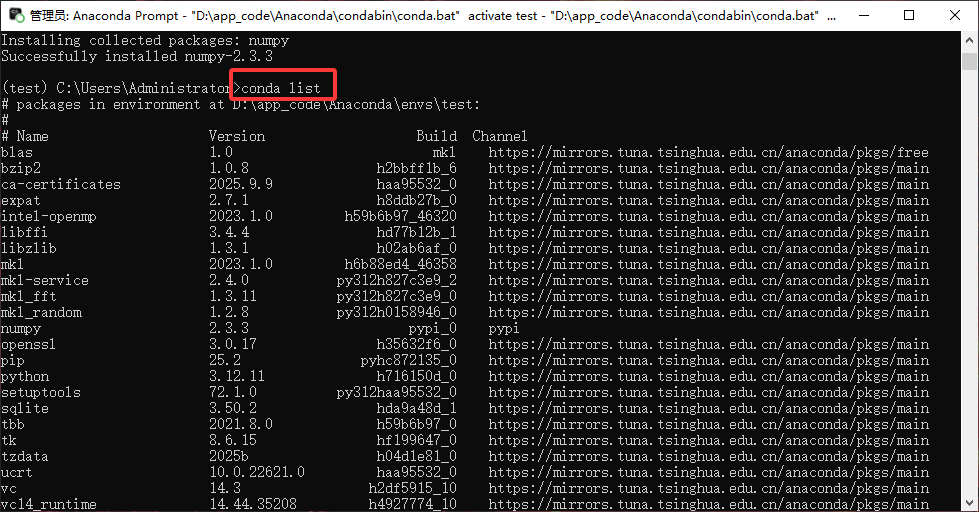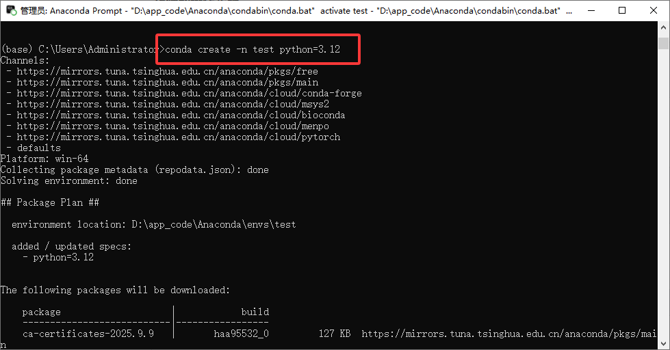 例如,创建一个名为 “test”、Python 版本为 3.12 的虚拟环境,命令如下: