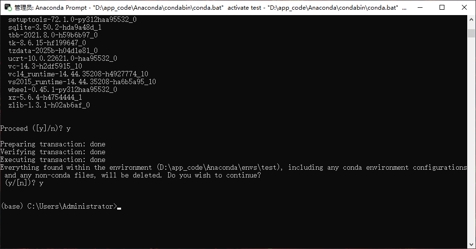 输入命令后,会提示是否确认删除,输入 “y” 并按下回车键,即可删除该虚拟环境。请注意,删除操作不可逆,删除前请确保该环境确实不再需要。