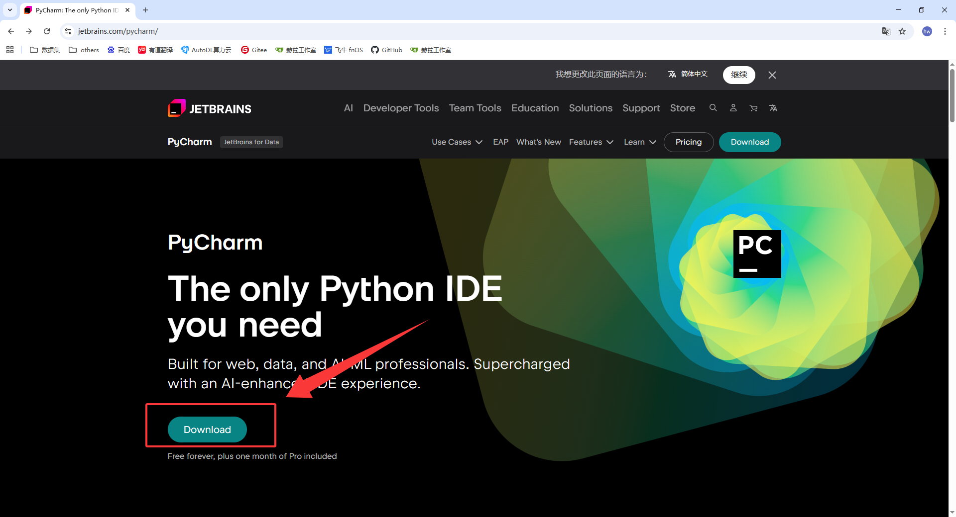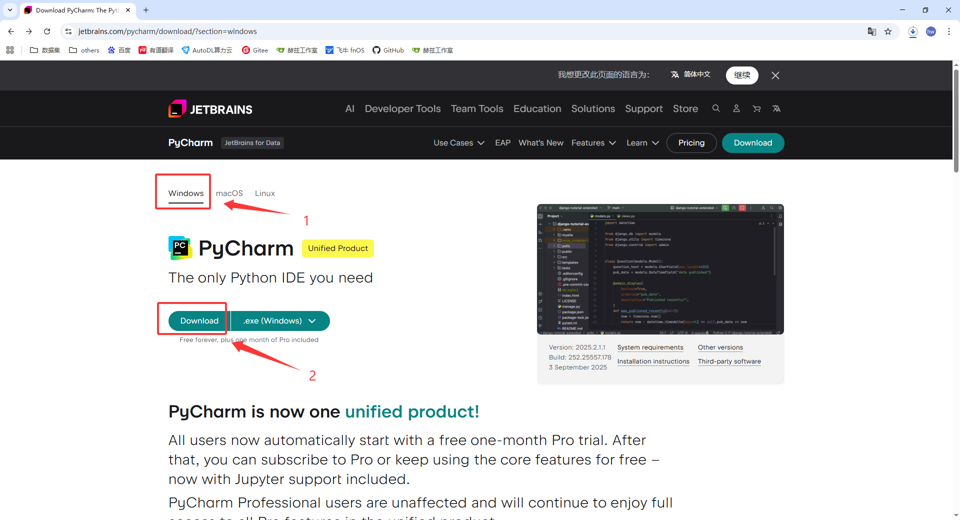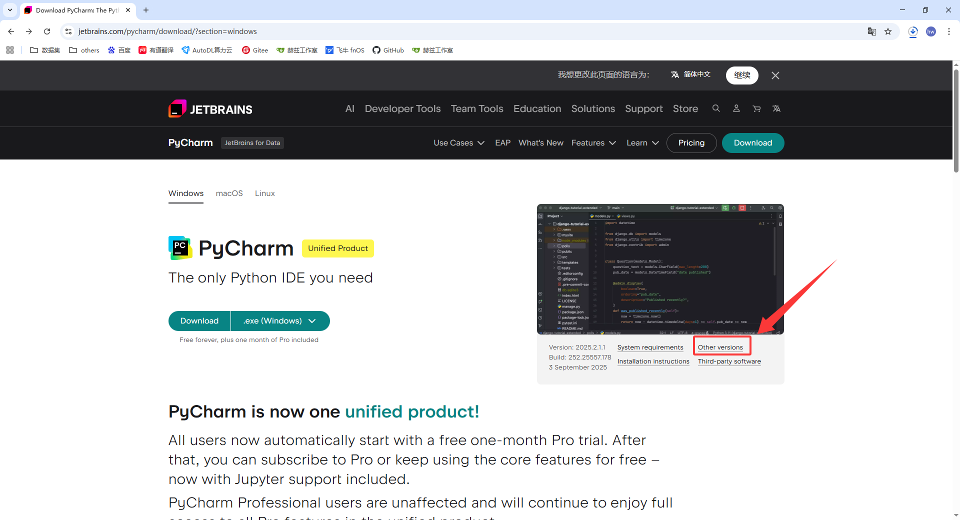 - 打开浏览器,访问 PyCharm 官网:PyCharm官网下载链接