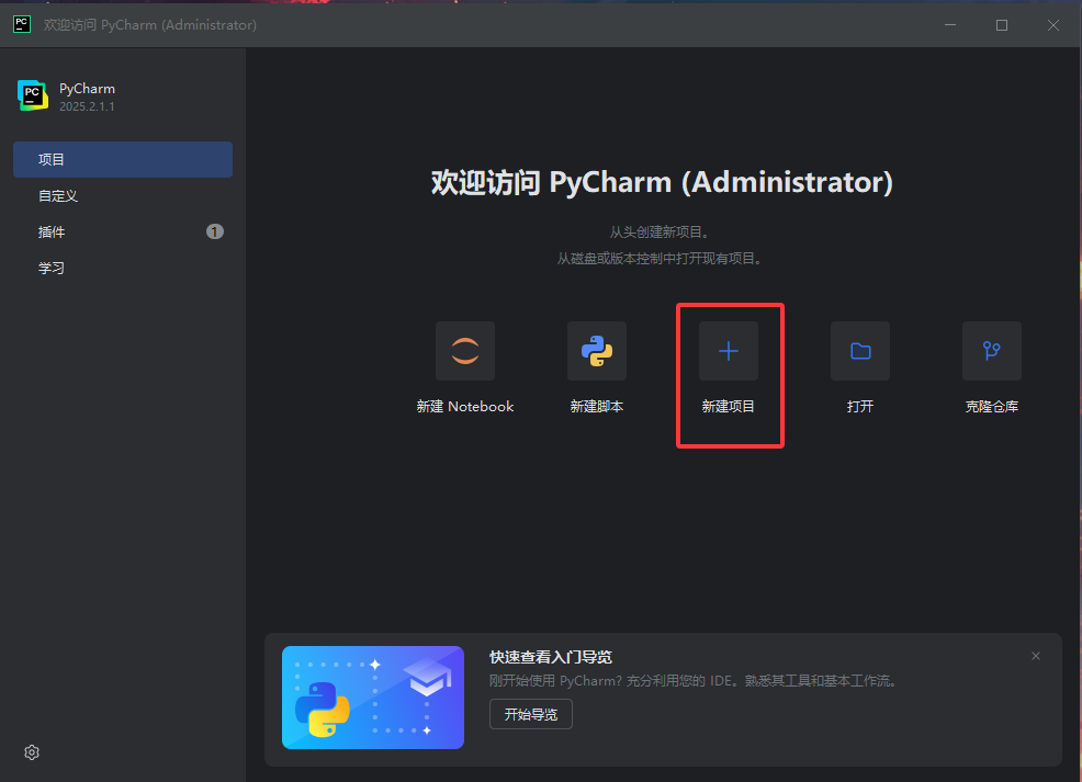 - 打开 PyCharm,首次启动会显示欢迎界面,点击 “New Project”(新建项目)。