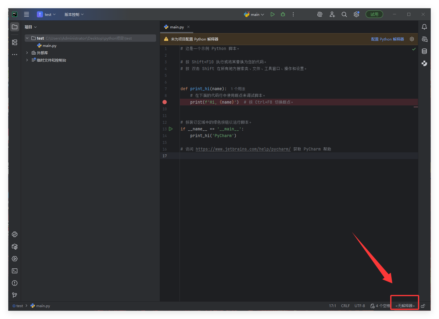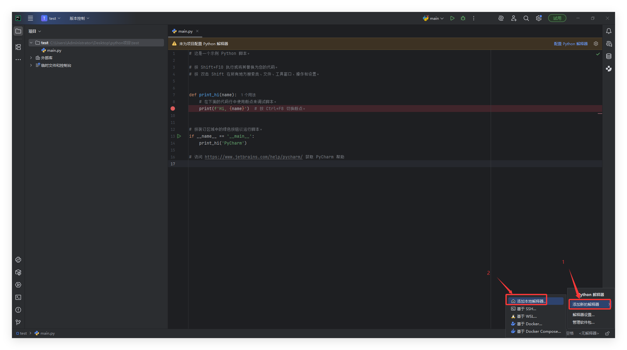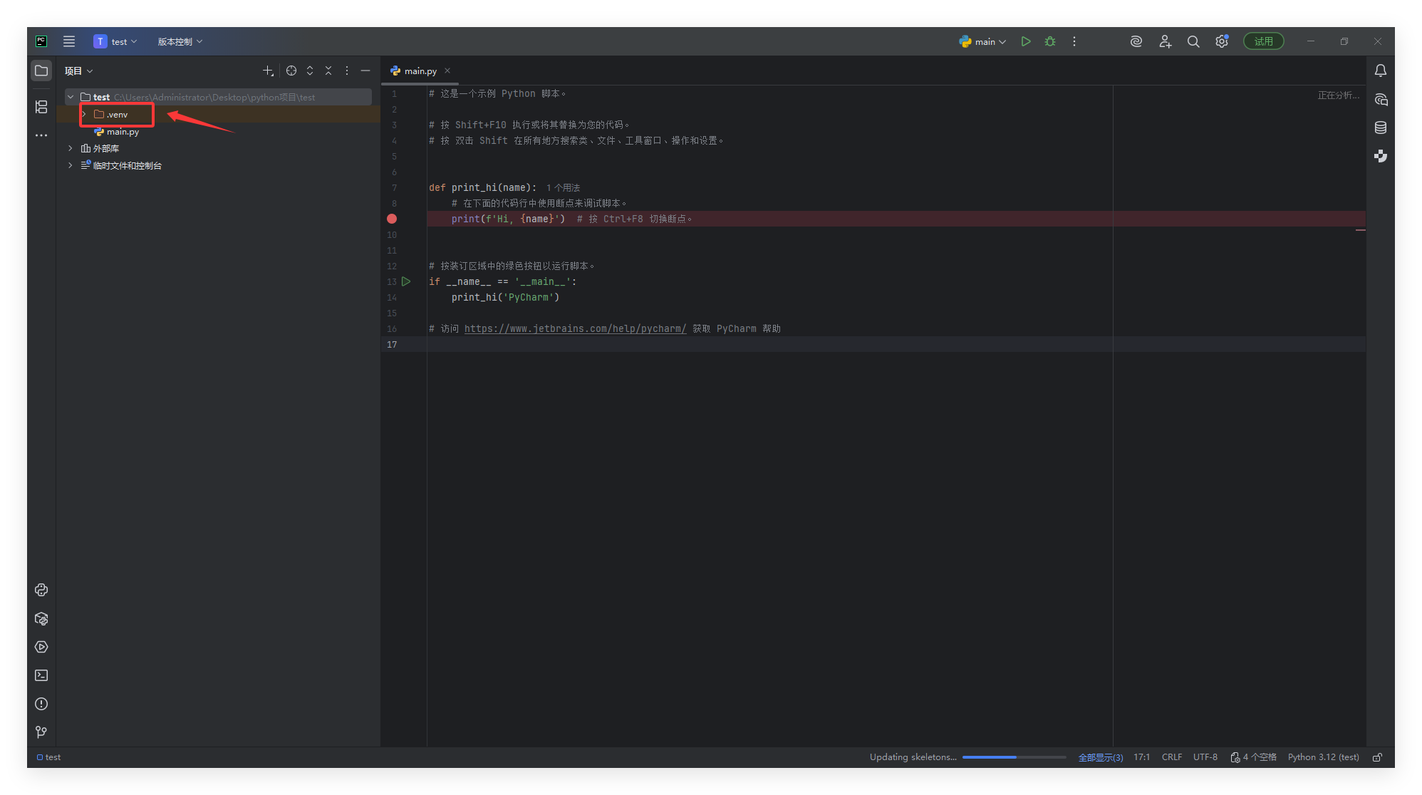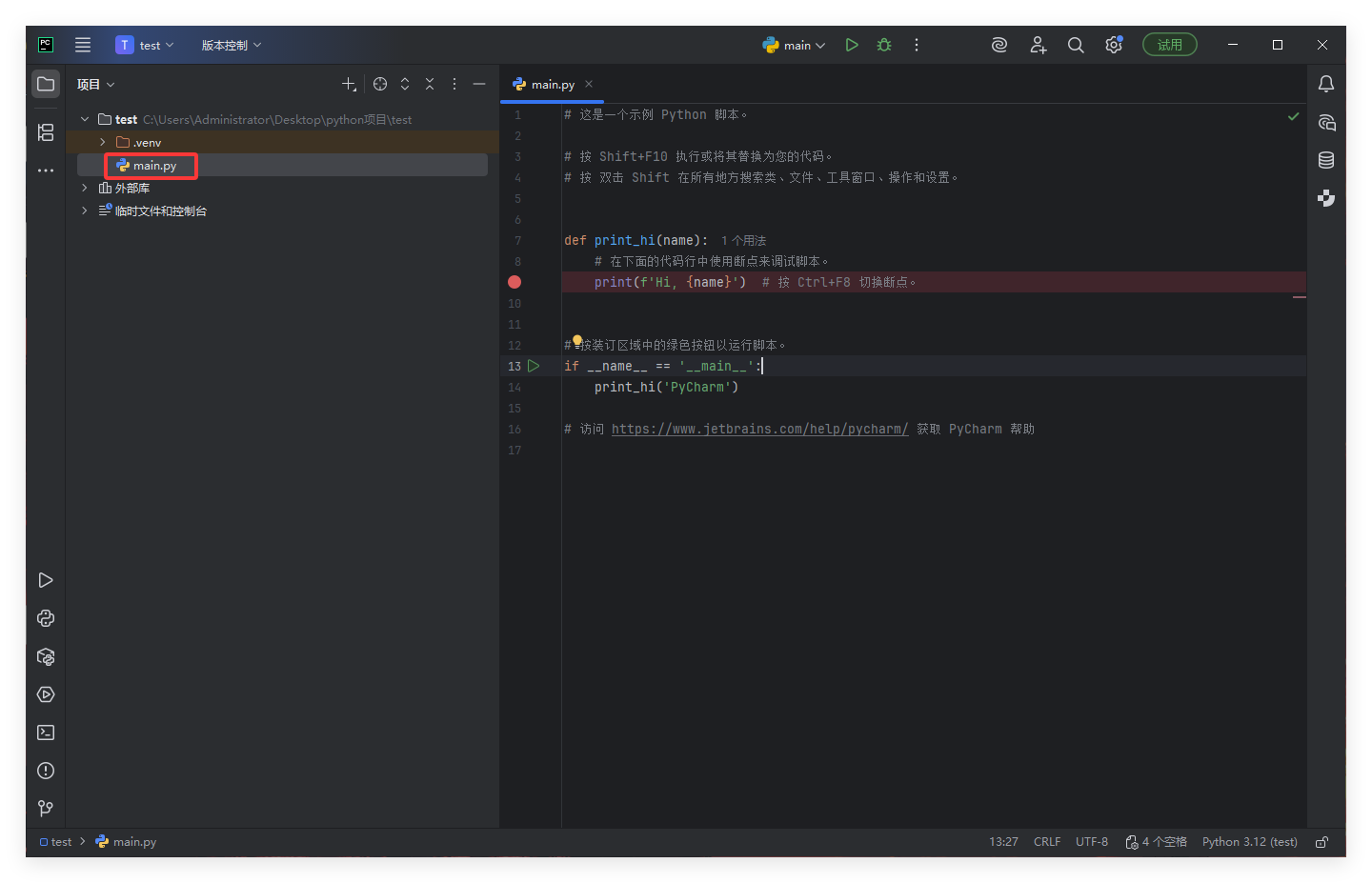 我这里是将文件夹拖入到PyCharm中,自动创建的main.py: