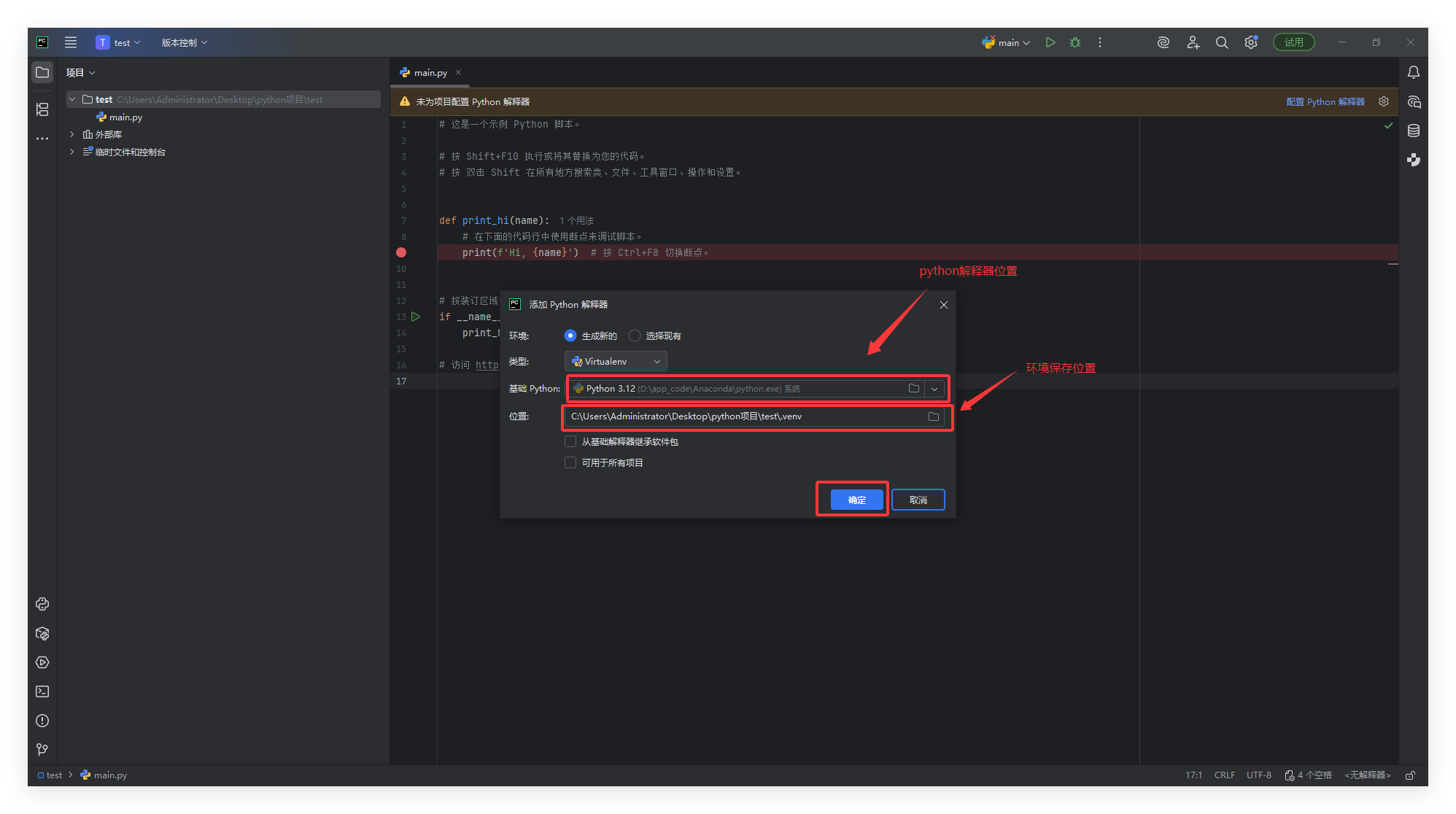 - 在 PyCharm 右下角点击创建环境。