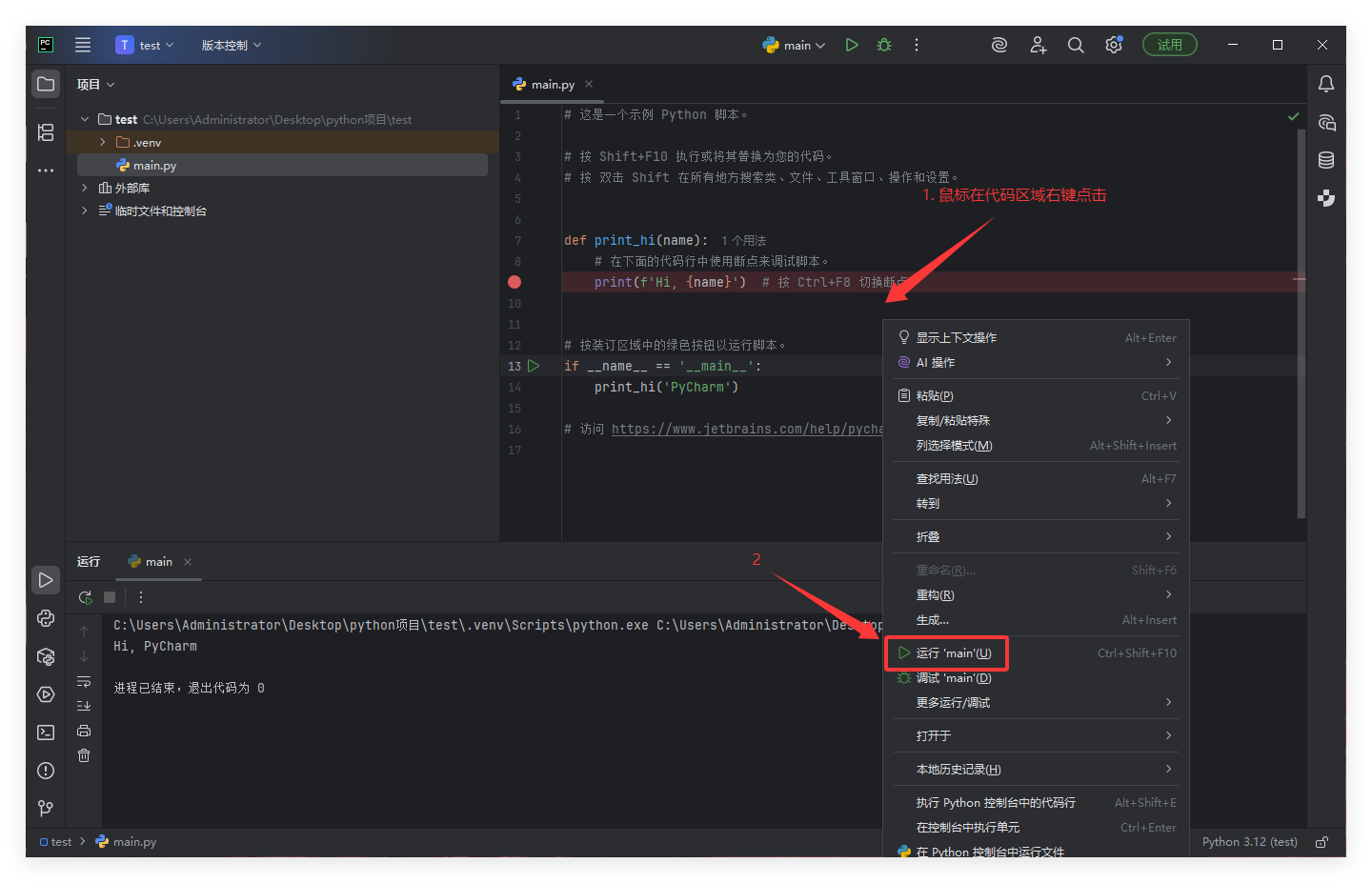 在代码区域右键单击,点击运行: