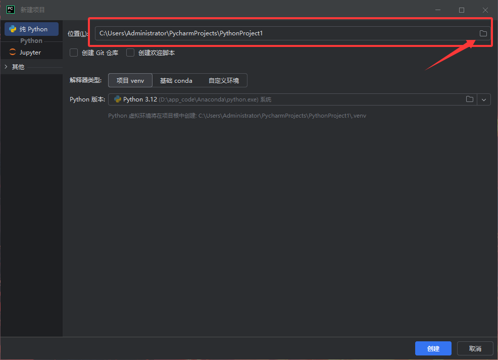 - Location:点击文件夹图标选择项目保存路径(例如D:\PythonProjects\FirstProject)。