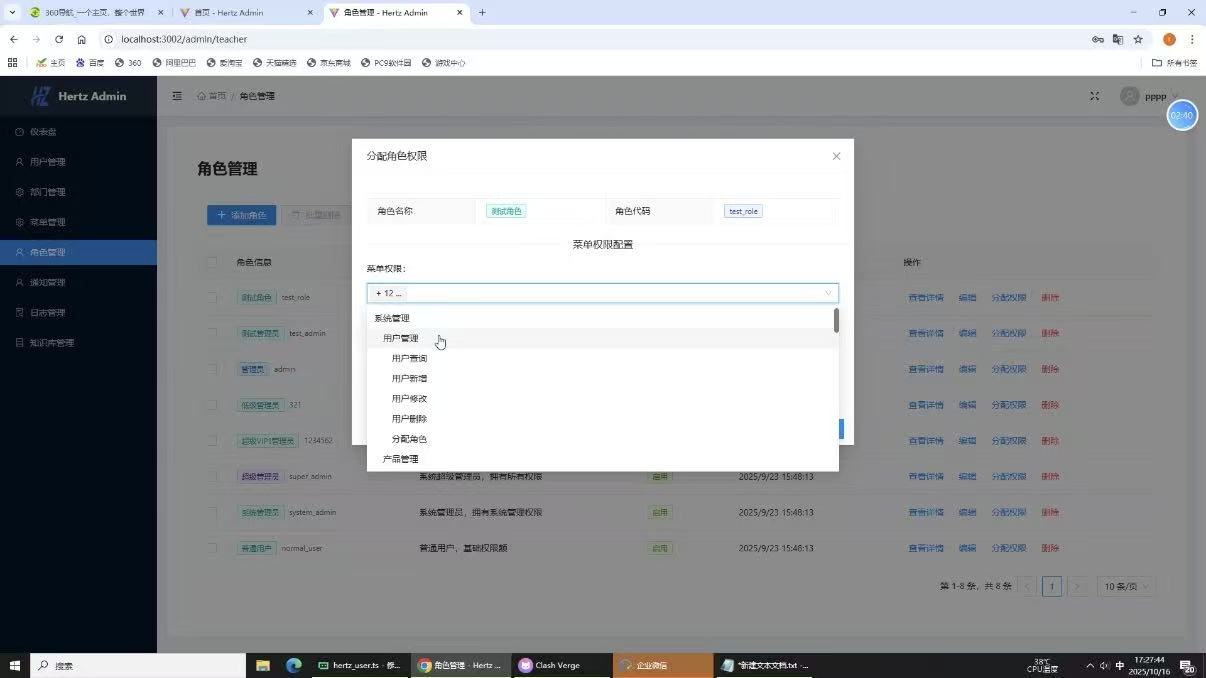 角色管理模块支持先定义角色再精准分配页面访问权限,后端通过 Django Group 模型创建角色,结合 Permission 模型定义页面访问权限,通过 API 实现角色与权限的关联绑定,前端则用 Vue 的 Form 组件编辑角色信息,配合 Checkbox 组件实现权限多选,提交后直接调用 API 保存配置,确保权限控制颗粒度