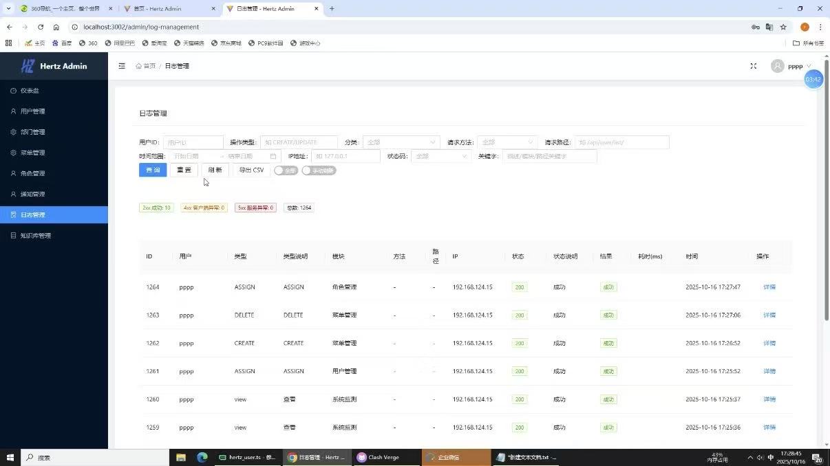 日志管理模块会自动记录所有操作行为(包括查看通知、修改信息等动作),后端通过 django-activity-log 记录操作人、操作时间、IP 地址、操作内容等日志数据,提供按时间、用户筛选的查询 API,前端则用 Table 组件展示日志列表,支持分页与关键词搜索,方便追溯操作轨迹