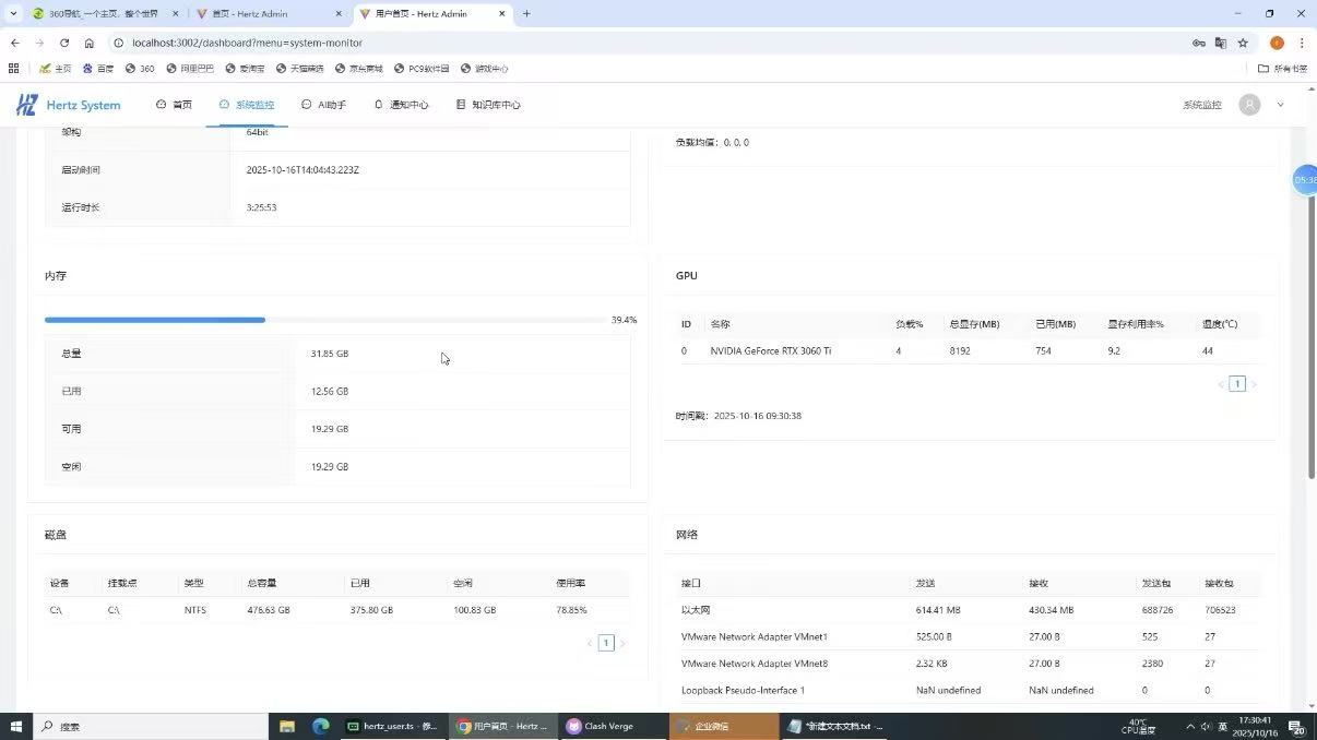 系统监控功能能实时查看设备 CPU 占用、运行内存等状态,后端通过 Django 集成 psutil 库采集硬件数据,再借助 Django Channels 实现 WebSocket 实时推送,前端则用 Vue 结合 ECharts 渲染动态监控图表,让数据可视化更直观;