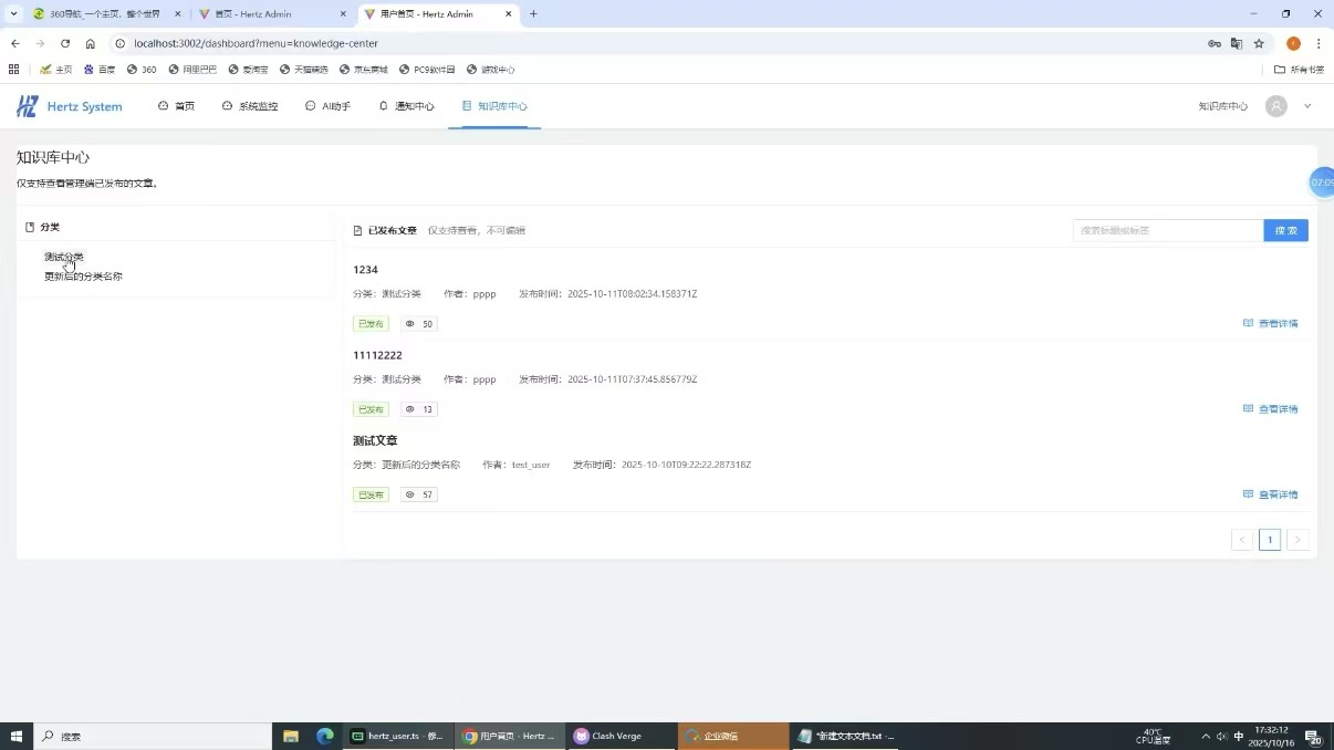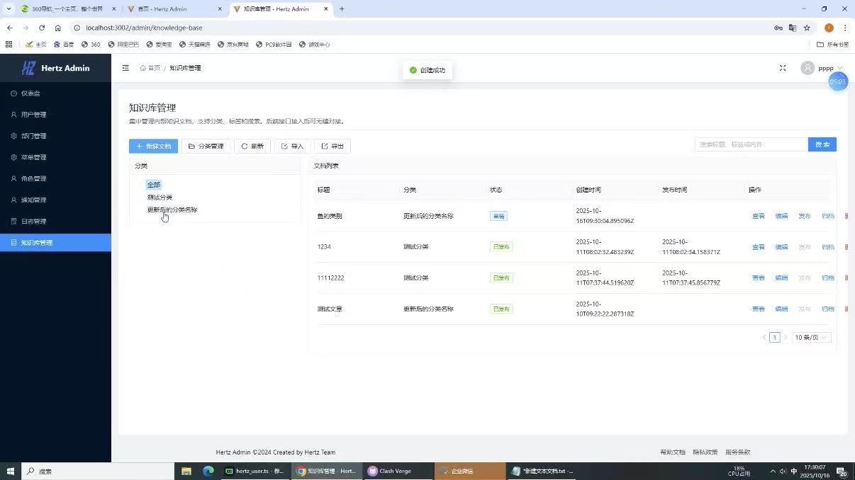 知识库管理相当于文章管理模块,后端通过 Django Model 定义知识库内容结构,提供编辑、删除、分类调整的 API,前端则用富文本编辑器实现内容修改,表格组件展示知识库列表,点击编辑即可调用 API 更新数据,灵活适配各类资料的维护需求