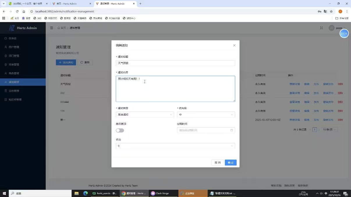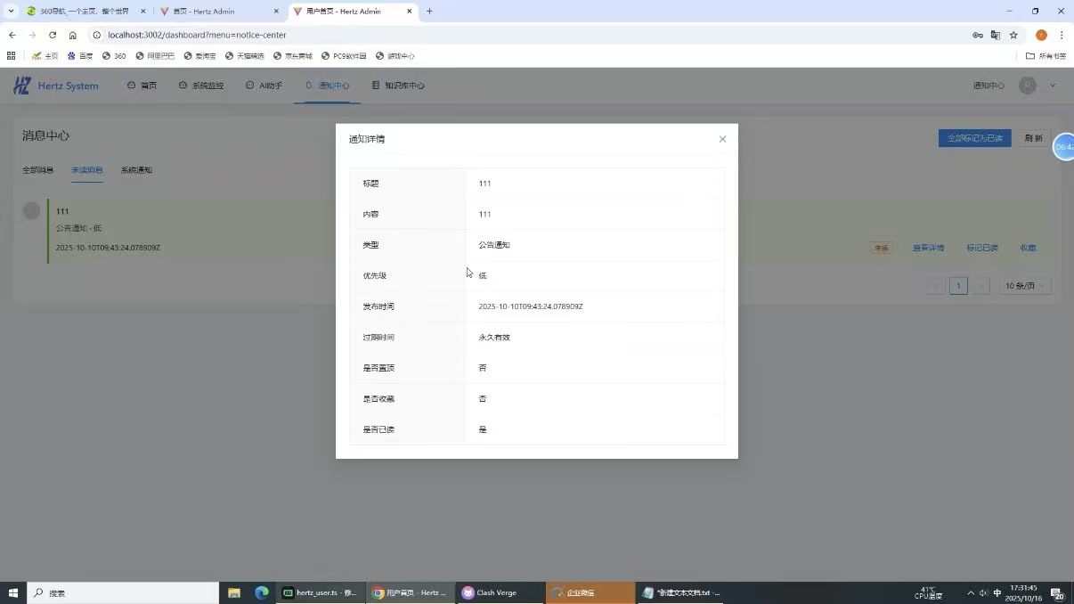 通知中心支持实时消息推送,后端通过 Django Signals 触发通知生成逻辑,将消息存储至数据库后,通过 Celery 异步任务推送至前端,前端则用 Vue 的定时请求或 WebSocket 监听新通知,确保消息实时性;