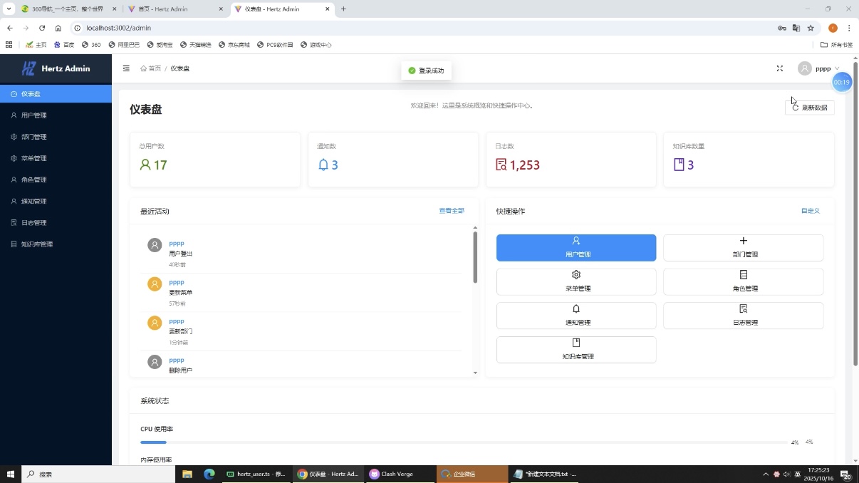 首先看到的仪表盘,当前展示的虚拟基础数据由后端 Django 集成 pandas 处理统计逻辑,通过 API 返回用户量、操作频次等聚合数据,前端则用 Vue 结合 Chart.js 渲染折线图、饼图等可视化组件,后续接入真实数据源时,只需修改 Django 的数据源配置(如对接 MySQL、PostgreSQL),前端无需改动即可实现数据更新,充分体现前后端分离的解耦优势