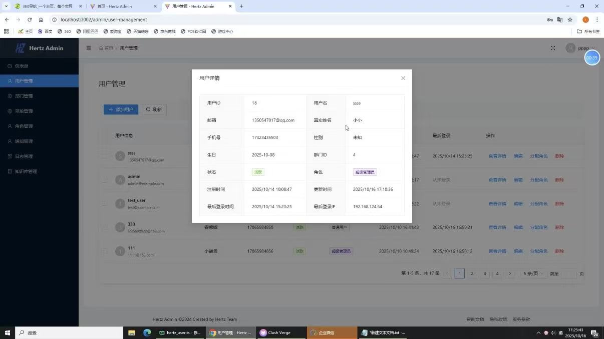 用户管理模块支持对所有用户进行增删改查操作,后端通过 Django REST Framework 提供完整的 CRUD API,权限控制依托 Django 的 Group 与 Permission 系统,选中用户分配角色时,通过 API 直接关联用户与角色模型,前端则用 Element Plus 的 Table 组件展示用户列表,支持分页、筛选与批量操作,操作按钮直接绑定后端 API 请求,简化开发流程