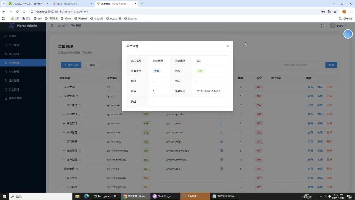 菜单管理模块可自定义系统内具体页面,后端通过 Django Model 定义菜单结构(含父级 ID、路由路径、图标标识等字段),提供菜单层级调整与状态切换 API,前端则用 Vue 的 Tree 组件展示菜单层级关系,编辑时通过 API 实时更新菜单数据,新增页面只需在 Vue 中创建对应组件并关联菜单路由,即可快速集成至系统