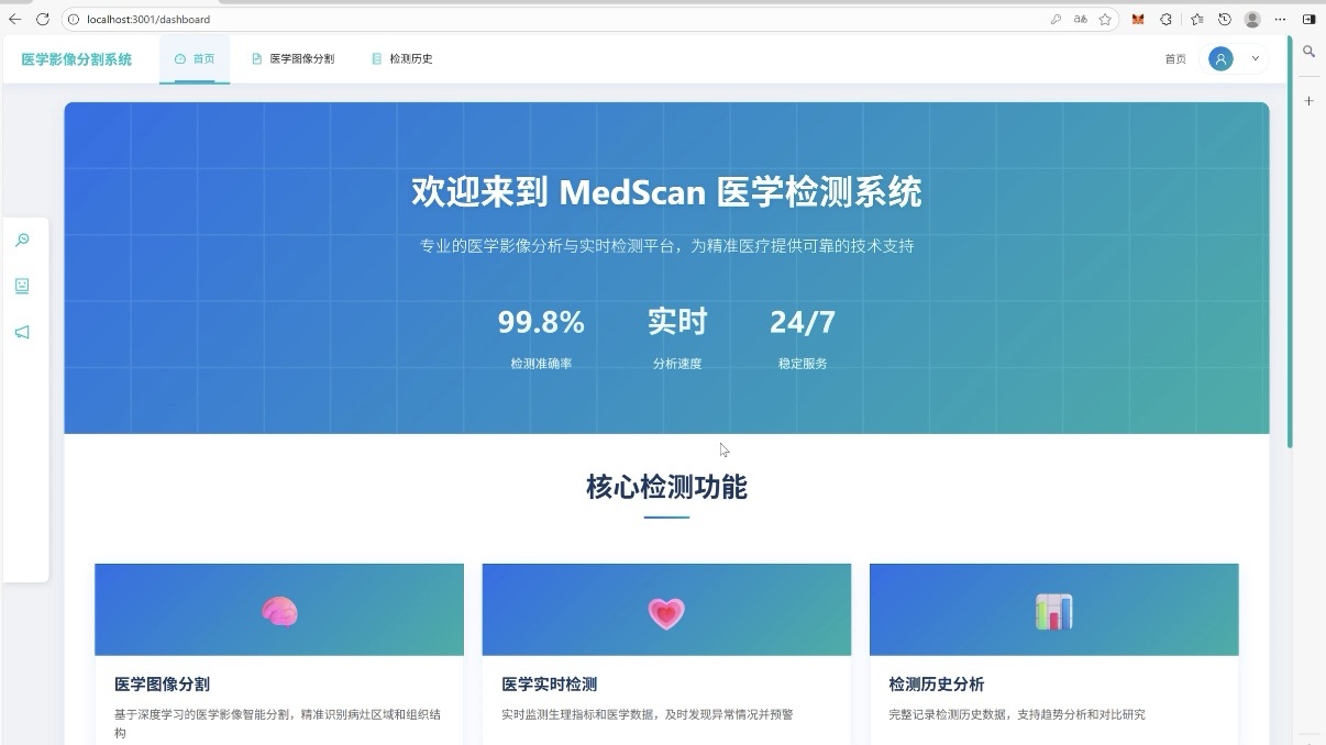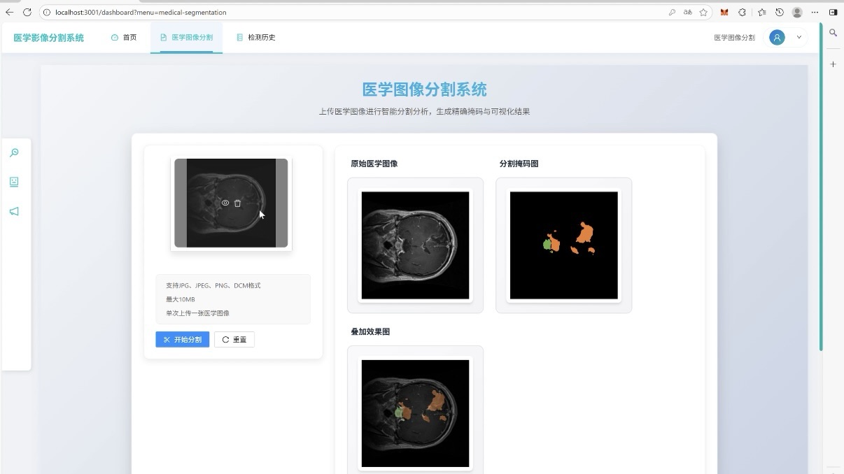 用户端核心功能模块,支持上传各类医学图像,点击启动后秒级输出分割结果。能精准识别小病灶、边界模糊区域,背后依托高效模型,平衡 “识别精度” 与 “处理速度”,是医疗影像分析的核心环节。