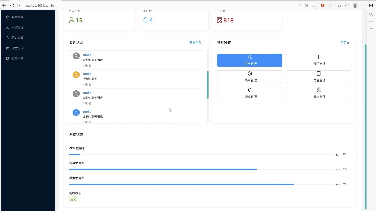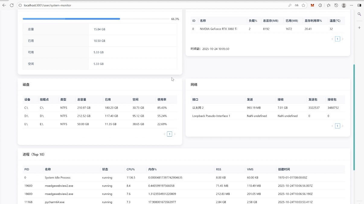 系统运行状态的 “仪表盘”,实时显示服务器 CPU / 内存占用、任务处理进度、异常预警等信息,通过可视化图表呈现,管理员能及时发现负载过高、卡顿等问题,保障系统稳定运行。