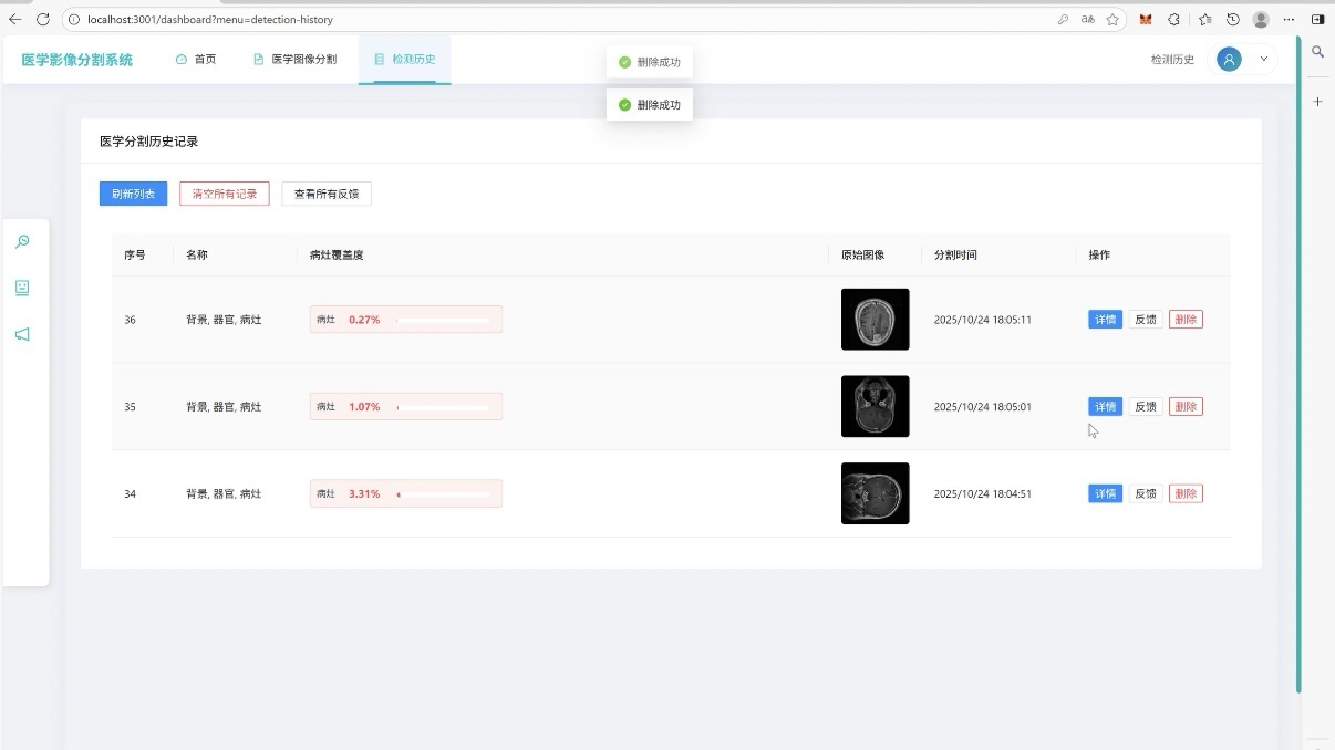 所有分割任务的 “档案库”,按时间 / 病例编号分类存储过往记录,点击某条记录就能回看原始图像、分割结果和分析报表,方便医生追溯病例、对比疗效,满足医疗场景的 “可回溯” 需求。
