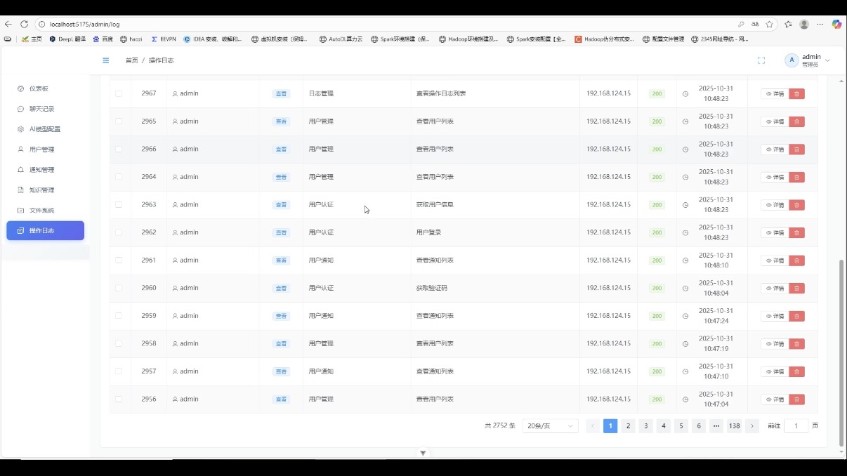 - 操作日志:借助 Element Plus 表格组件与 TailwindCSS 原子化样式,快速搭建出规范的日志展示界面,截图中排序、筛选功能的实现,体现了组件库与样式库的高效结合。