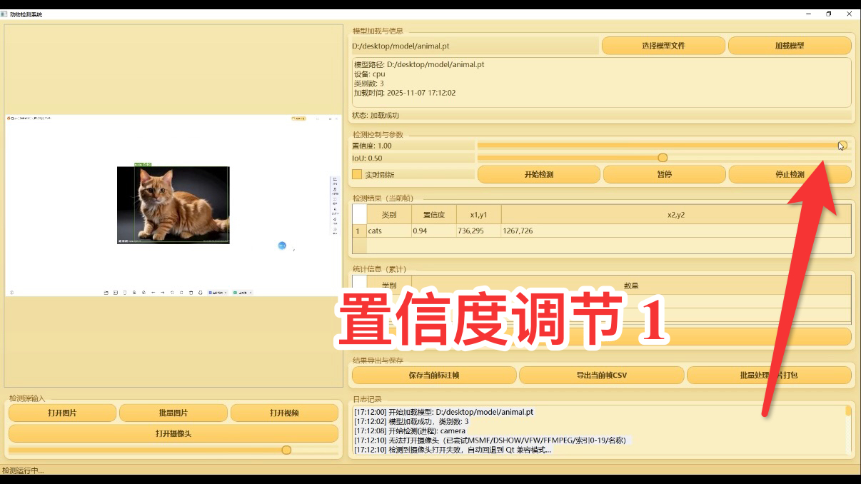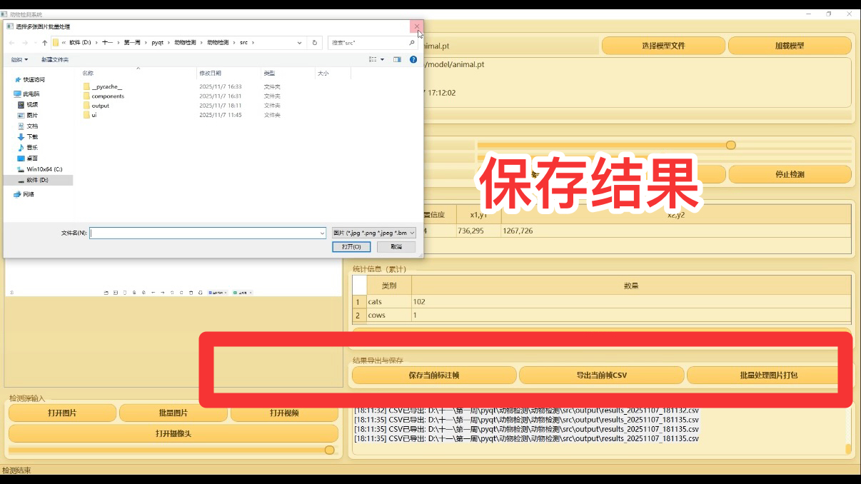 - 支持单帧结果导出:保存当前标注帧为 PNG 图片,导出检测结果为 CSV 格式(含类别、坐标、置信度等信息)