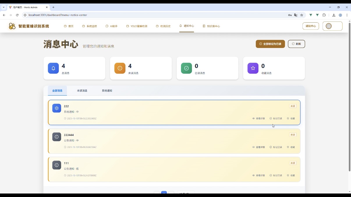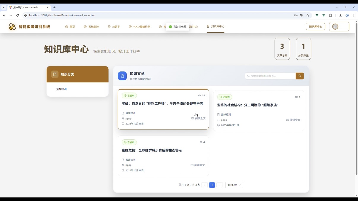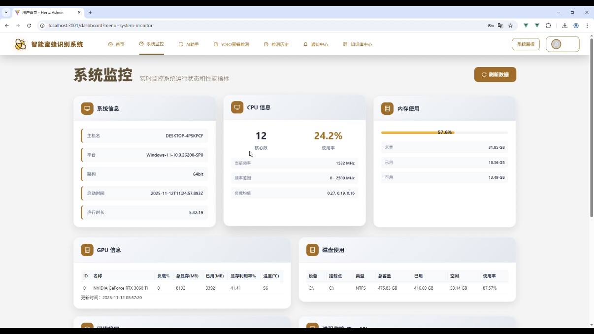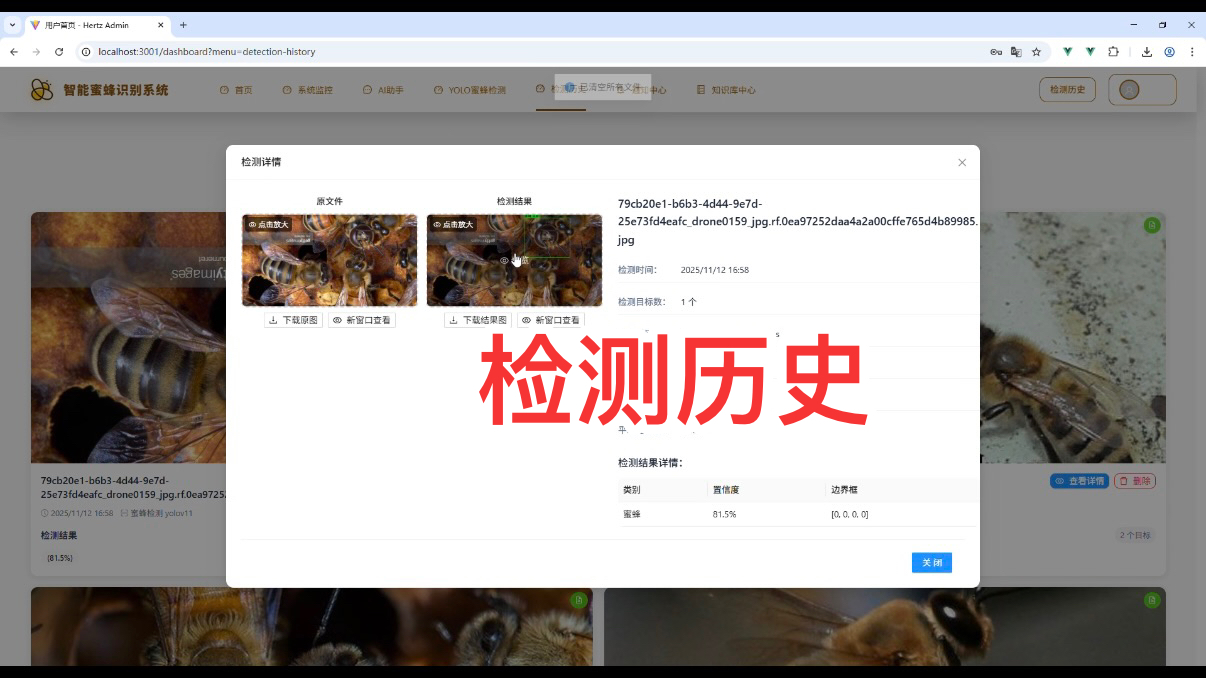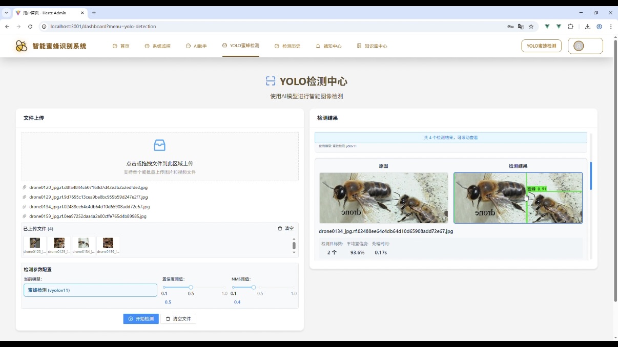 在计算机视觉与 Web 开发结合的实际应用场景中,智能目标识别系统的需求日益增长。本文将详细介绍一款智能蜜蜂识别系统的技术选型、核心功能模块及架构设计,该系统融合了前端主流框架、后端稳定技术栈与先进的 AI 检测模型,可作为计算机专业毕业设计或实际项目开发的参考案例。
