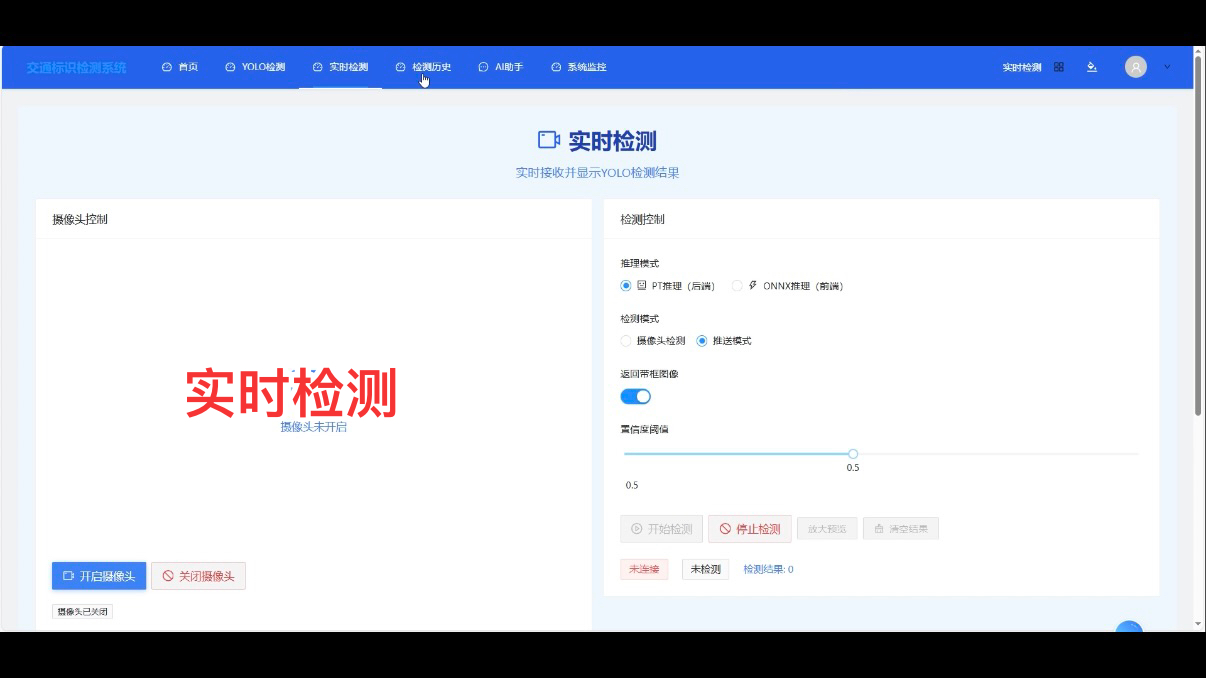 - 实时检测:通过摄像头或视频流输入,基于 WebSocket 实时传输视频帧,后端实时推理并返回检测结果,前端即时展示检测框与标识信息,延迟控制在数百毫秒内。