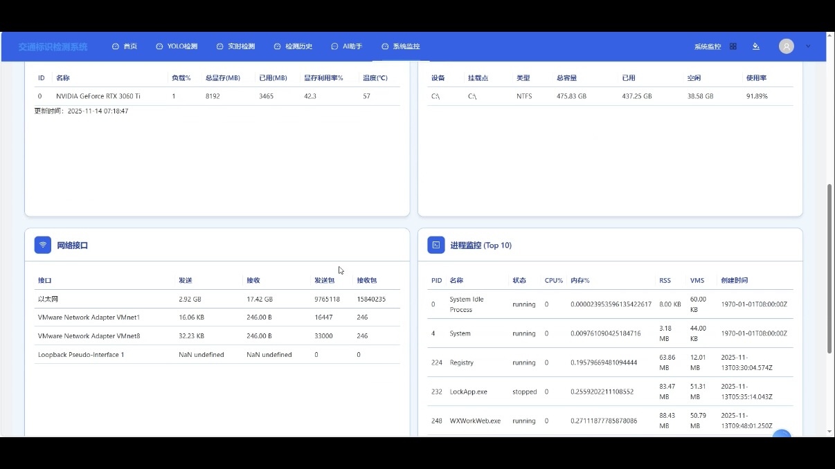 - 统计分析:基于 ECharts 生成检测频次趋势图、标识类型分布饼图、告警等级统计柱状图等,为交通管理决策提供数据支撑;